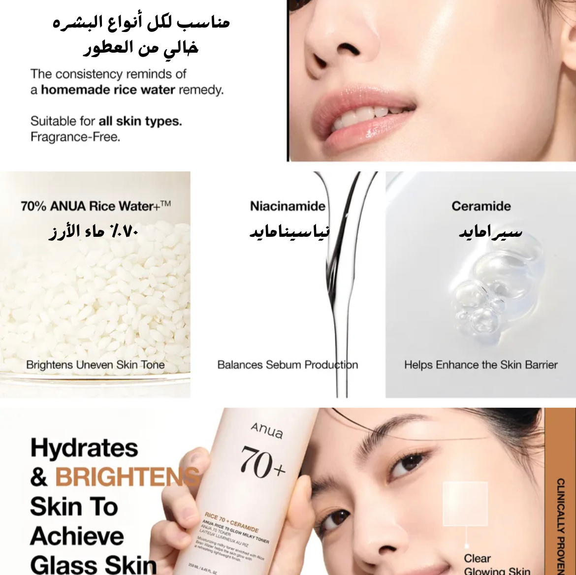 **مع Anua - Rice 70 Glow Milky Toner، فإن البشرة الصحية والمتألقة على بعد خطوة واحدة.**
