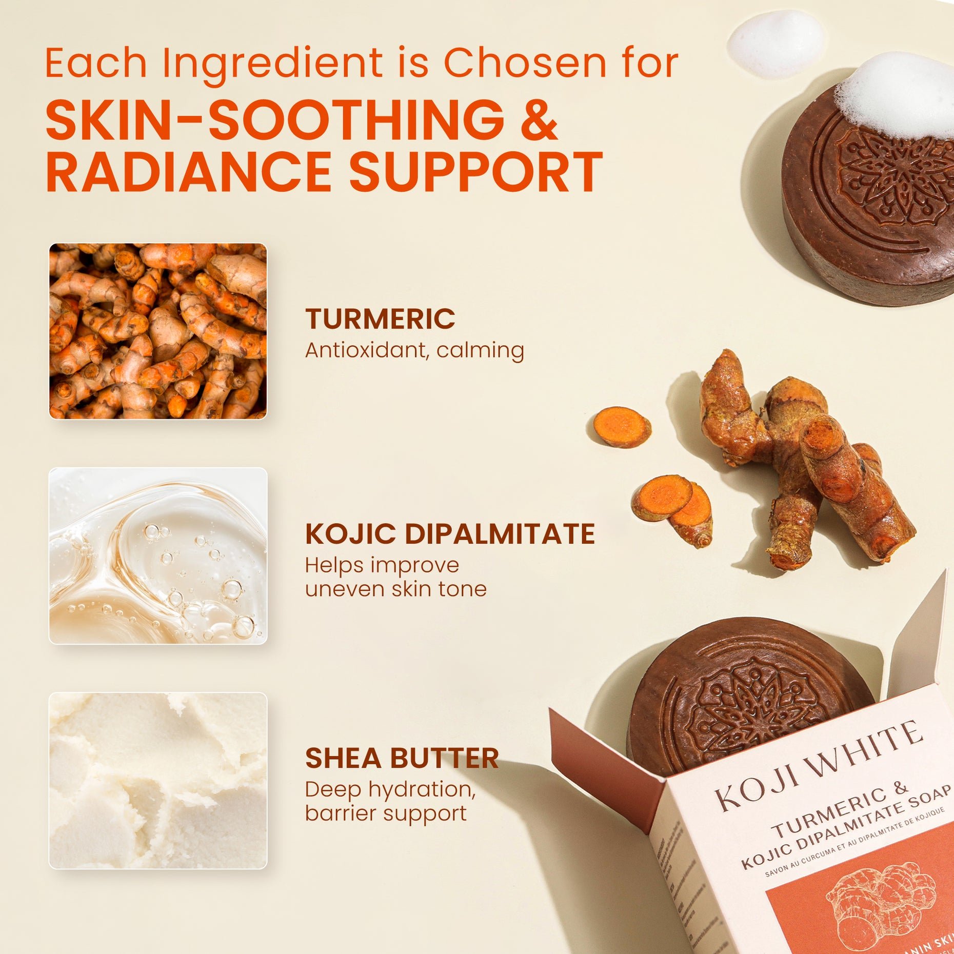 صُممت هذه الصابونة بتركيبة متطورة تجمع بين قوة الكركم الطبيعي وكوجيك أسيد دي بالميتات، لتساعدك على استهداف
