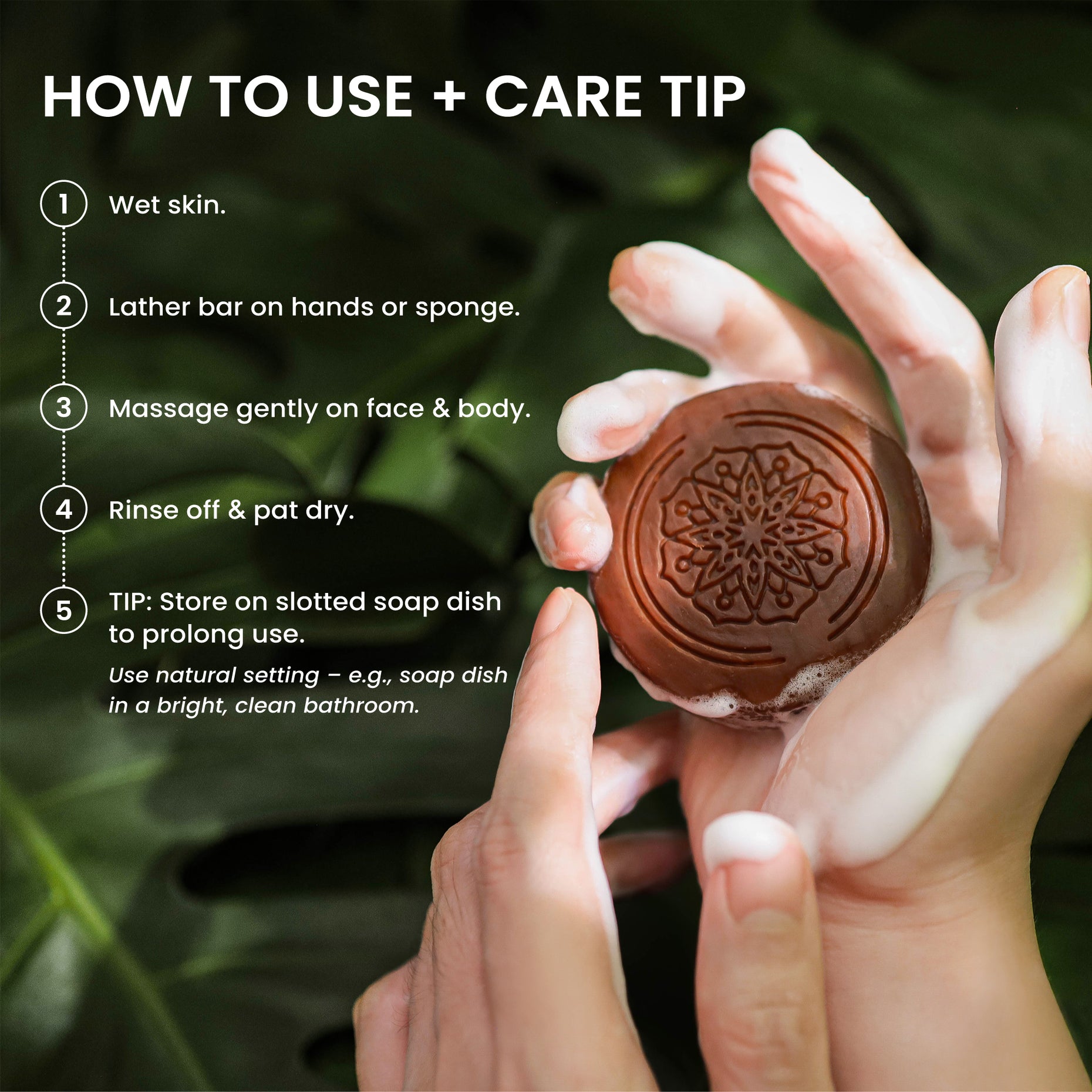 ٢- دلّكي الرغوة بلطف على الوجه أو الجسم، مع التركيز على المناطق الغامقة.