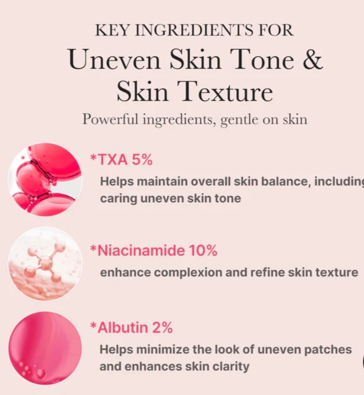 - 5% Tranexamic Acid (TXA): يقلل من التصبغات العنيدة ويوحّد