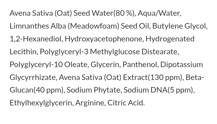 🔹 ماء بذور الشوفان (Oat Seed Water 80%): يرطّب البشرة بعمق ويعيد مرونتها ويهدّئ الالتهابات.